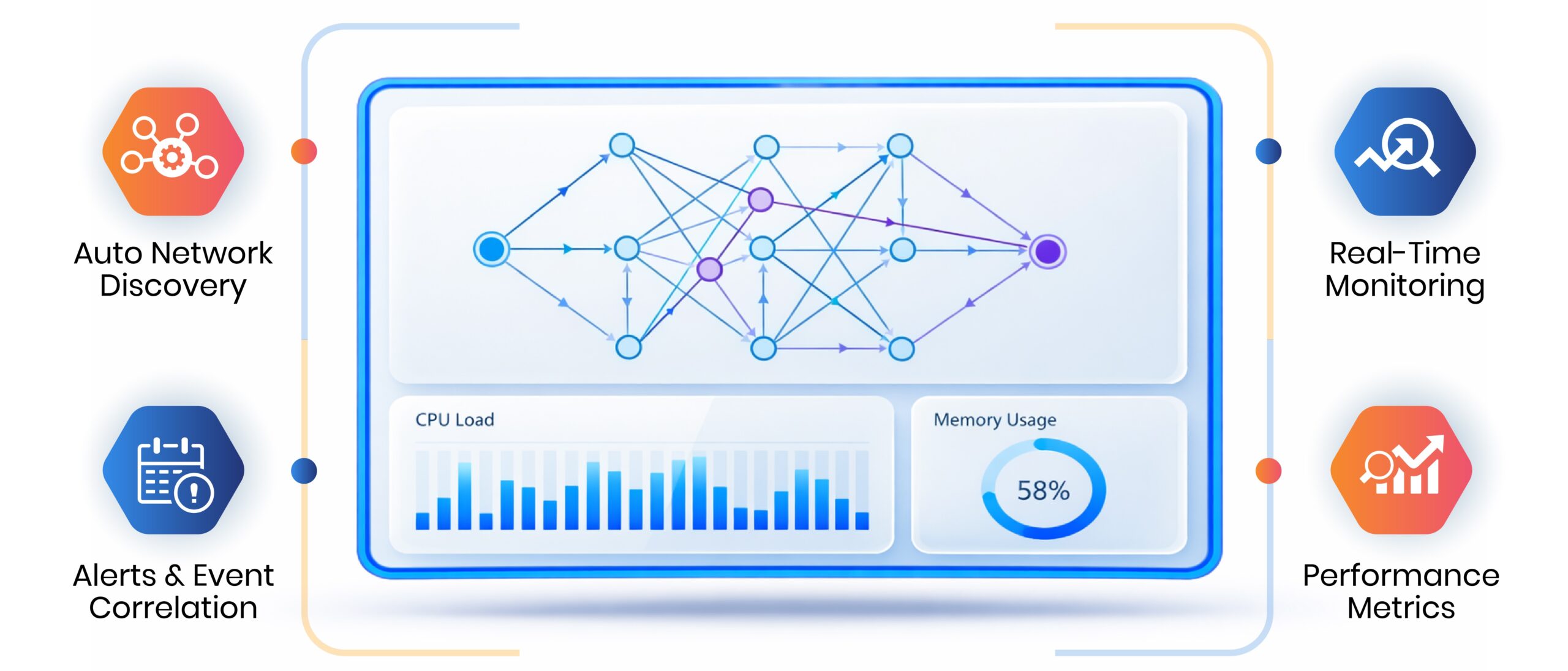 The ezAtlas NMS module cuts through the noise of complex enterprise networks by using smart auto-discovery to build a live, multi-dimensional view of your traffic. We turn raw infrastructure telemetry into actual intelligence, helping your team bridge visibility gaps and keep the entire distributed environment healthy. From aging on-premise hardware to fluid cloud instances, NMS makes sure your digital backbone stays resilient and fully tuned to your business needs.