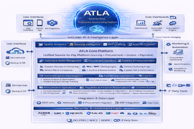 ATLA is a unified Source-to-Pay (S2P) platform that digitizes and automates the complete procurement lifecycle—from sourcing and supplier onboarding to procurement, invoicing, and payments—enabling enterprises to achieve full control, visibility, compliance, and cost optimization across both direct and indirect spend.